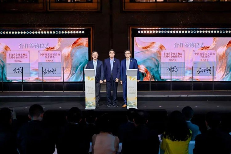中宝协会长叶志斌,珠宝玉石首饰国检集团党委书记、董事长顾晓华,黄浦区委书记杲云,上海市商务委总经济师罗志松,黄浦区人民政府副区长沈丹娜,上海钻石交易所总裁林强,中国黄金报社党委书记、社长李广国,上海国际时尚联合会会长、复星国际联席首席执行官徐晓亮,豫园股份董事长、黄浦区工商联主席黄震,全国工商联金银珠宝商会秘书长黄滢,世界黄金协会中国区首席执行官王立新,中国地质大学(武汉)珠宝学院党委书记薛保山,上海黄金交易所副总裁李华,中国(上海)宝玉石交易中心首席执行官陈昱,上海检验检测认证公司党委副书记、副总裁王虎,全国首饰标准化技术委员会副主任委员兼秘书长李素青,以及高校代表、交易所代表、珠宝检测机构代表、黄金珠宝品牌代表等200余人共同见证签约仪式。