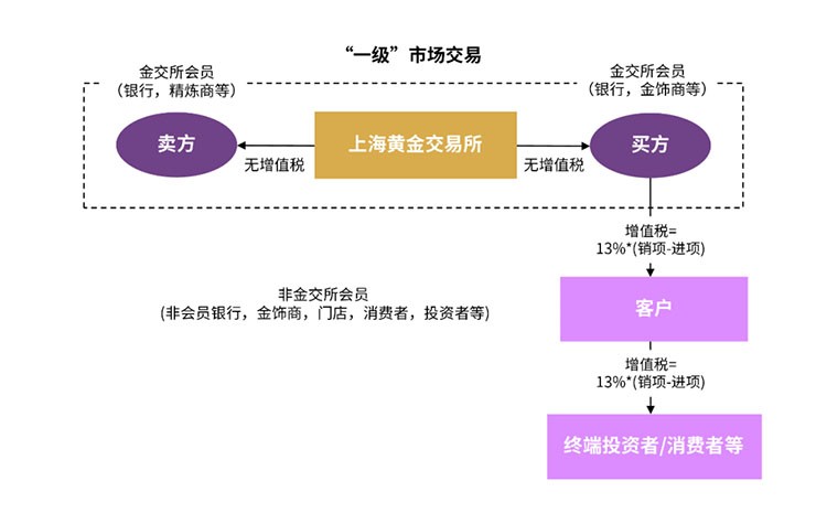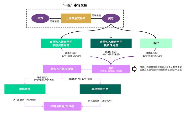 根据新政规定,在上海黄金交易所直接买卖黄金的会员(即所谓“一级供应”)仍享受增值税免征政策,但提现黄金的会员现需根据投资或非投资用途适用不同政策。以投资为目的提取实物黄金并进行转售的会员不受影响,因其仍按现行政策对增值部分缴纳13%增值税;而非投资用途的会员在分销时将面临更高成本。通过上海黄金交易所会员代理的客户(亦称交易所客户)从交易所提取黄金时亦将面临更高的纳税义务。