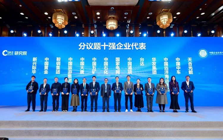 《企业社会责任蓝皮书(2025)》发布之后,责任云研究院院长、教授钟宏武为“分议题十强企业”获奖企业代表颁发证书,中国黄金集团作为企业代表上台领奖并合影留念。
