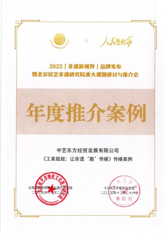 近日,由北京民艺非物质文化遗产研究院主办、《人民艺术家》杂志社协办的2025“非遗新视界”品牌发布暨北京民艺非遗研究院重大课题研讨与推介会在京举行。中艺东方策划实施的《工美姐姐:让非遗“趣”传播》传播案例,从全国762份案例中脱颖而出,成功入选2025年度推介传播案例。作为中艺东方旗下文化传播IP,“工美姐姐” 自2022年创立以来,始终秉承“让工艺美术传播更有趣”的目标,深耕非遗文化传播赛道,构建起覆盖非遗科普、节气主题内容、数字表情包等在内的多元内容矩阵,屡次获得国家级大赛奖项。未来,中艺东方将持续以“工美姐姐”IP为核心,深化内容创新与跨界融合,推动中华优秀传统文化更好融入当代生活与大众审美,为传统工艺注入持续发展的新活力。