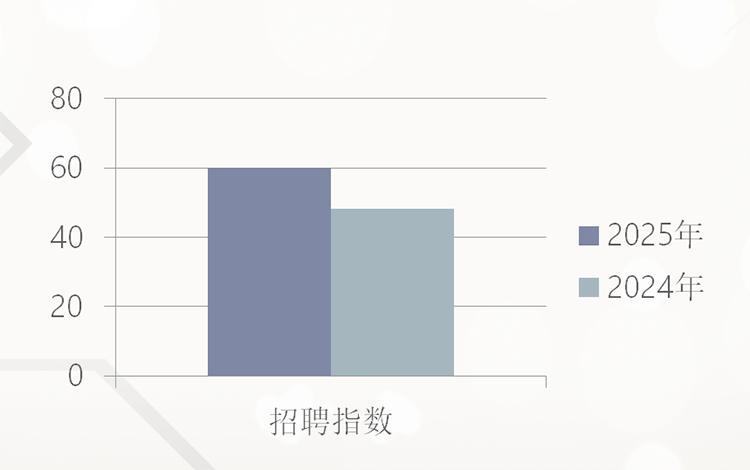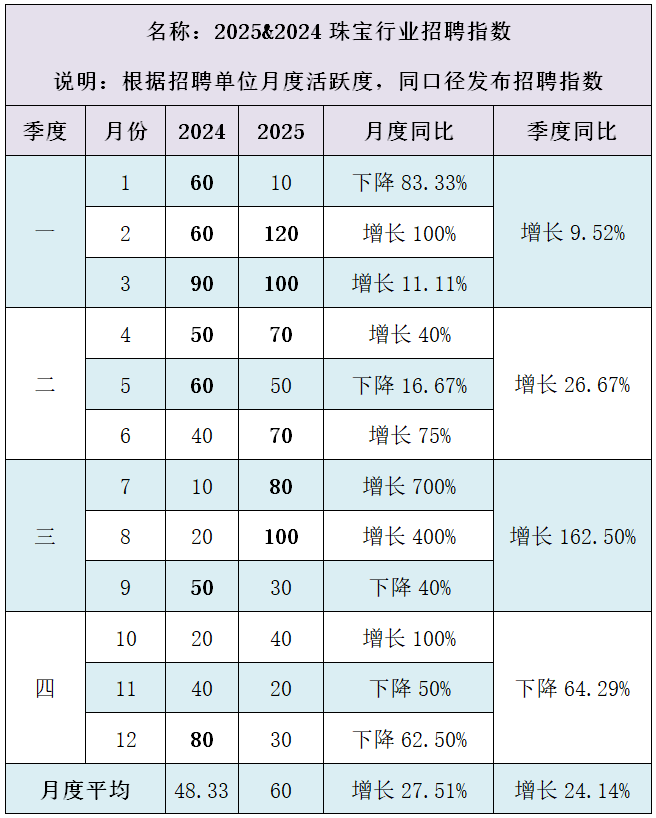 2025年珠宝行业招聘指数月度平均值为60,同比2024年珠宝行业招聘指数月度平均值48.33,增长11.67,增长达到24.14%。