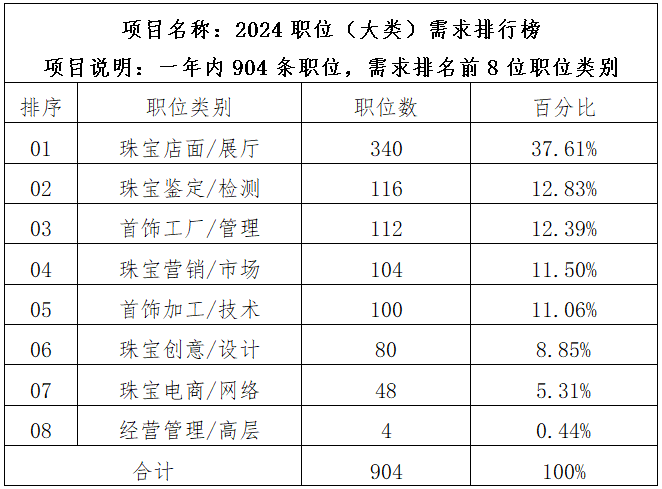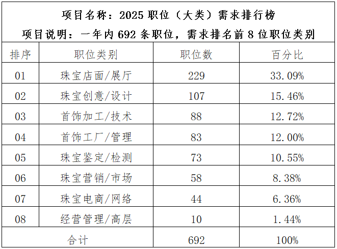 2025年,珠宝人才网在中国职业技术教育学会珠宝教育专业委员会的指导下,选取100家招聘单位作为统计样本,发布《2025中国珠宝行业人才需求情况统计报告 》,欢迎查阅,仅供参考。