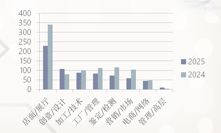 2025年,经营管理/高层人才需求仍然在低位徘徊,懂经营,会管理,有客户资源,能创造效益的人才,“可遇不可求”,很多珠宝企业都考虑从内部晋升,很少面向社会招聘。