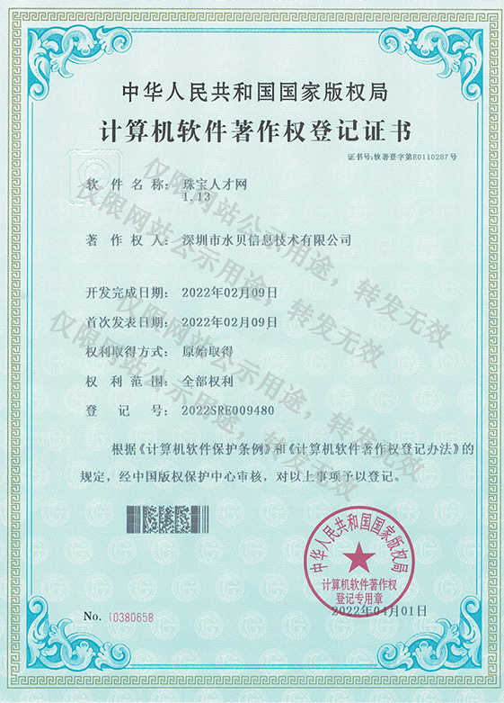 深圳市水贝信息技术有限公司已获得国家知识产权局“水贝云”商标注册证【第73011631号】;深圳市水贝信息技术有限公司已获得中华人民共和国国家版权局“珠宝人才网”计算机软件著作权登记证书【登记号:2022SRE009480】。任何第三方平台使用“水贝云”商标,抄袭珠宝人才网介绍,模仿珠宝人才网界面,转载珠宝人才网信息,均属于侵权行为,深圳市水贝信息技术有限公司保留诉诸法律的权利。
