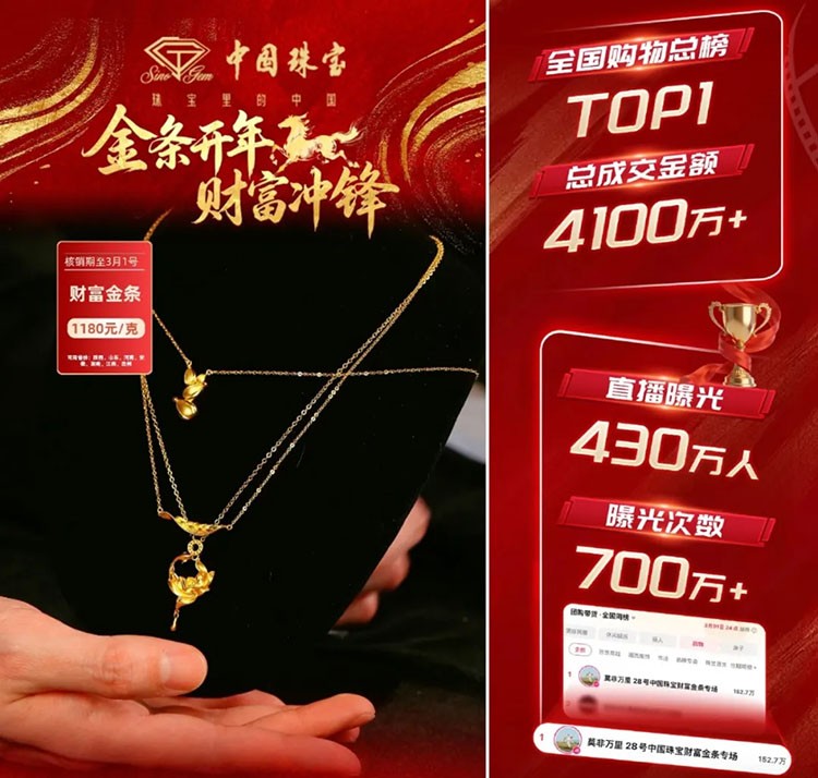2月28日,中国珠宝开年专场达人带货直播引发抖音平台消费热潮,总成交额突破4100万元,累计曝光超700万次,强势登顶抖音全国团购带货全品类第一,同时拿下珠宝首饰类日榜、周榜双第一。核销周期内,中国珠宝稳居综合珠宝商家总榜第一、飙升榜第一,迎来马年“开门红”。本次直播以“金条开年 财富冲锋”为主题,精准把握开年黄金消费市场旺季需求,联合抖音生活服务头部达人,为消费者带来新春好彩头与沉浸式购物体验,充分彰显中国珠宝在新零售业态中的品牌影响力与市场认可度。下一步,中国珠宝将持续深化全渠道战略布局,以文化为核、创新为翼,不断拓展“珠宝里的中国”IP价值,引领国潮消费新趋势,为广大消费者带来更优质的产品与服务,为行业高质量发展注入品牌动能。