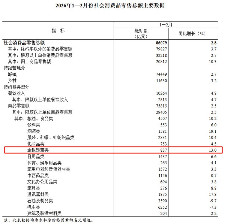 3月16日,国家统计局发布1—2月份社会消费品零售数据显示,1—2月份,社会消费品零售总额86079亿元,同比增长2.8%。其中,金银珠宝类限额以上单位商品零售额837亿元,同比增长13%。