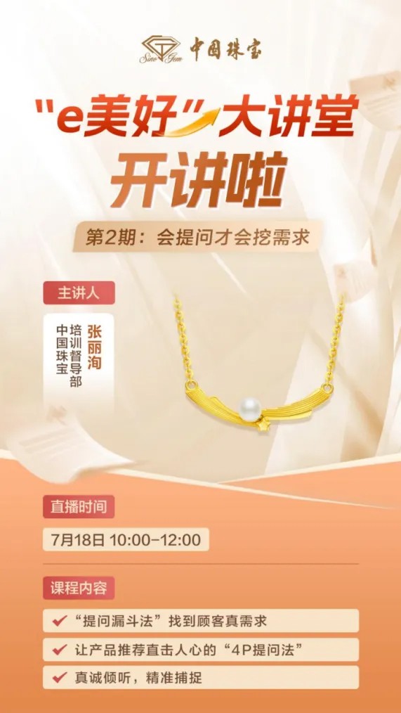 近日,中国珠宝“e美好”大讲堂系列课程正式上线。该系列课程注重实用性与前瞻性,旨在全面提升终端门店导购及相关业务人员的专业素养与销售能力,内容涵盖珠宝专业知识、实用销售技巧及创新营销方法等。目前,中国珠宝已开展2期线上直播课程,品牌终端门店营业员、线上销售人员等千余学员参与课程学习。后续,中国珠宝将定期开展培训,持续优化课程体系,为员工赋能,进一步推动企业服务升级与人才建设,为消费者带来专业、放心的优质服务体验。