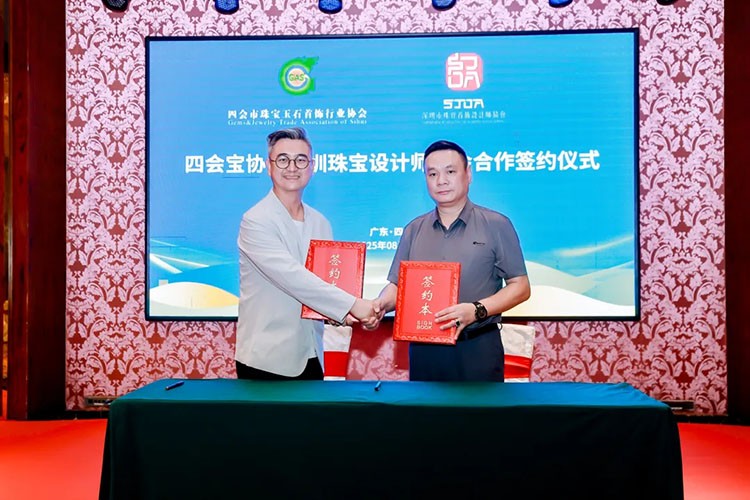 2025 年8月11日,四会宝协第四届理事会第一次理事(代表)大会暨镶嵌分会第二届理事会就职典礼隆重举行。深圳市珠宝首饰设计师协会会长杜半、副秘书长余悦衔出席了此次活动。此次盛会汇聚了众多珠宝行业的精英人士,与此同时四会宝协与深圳市珠宝首饰设计师协会达成的 “深圳?四会” 翡翠新品联合设计战略合作。