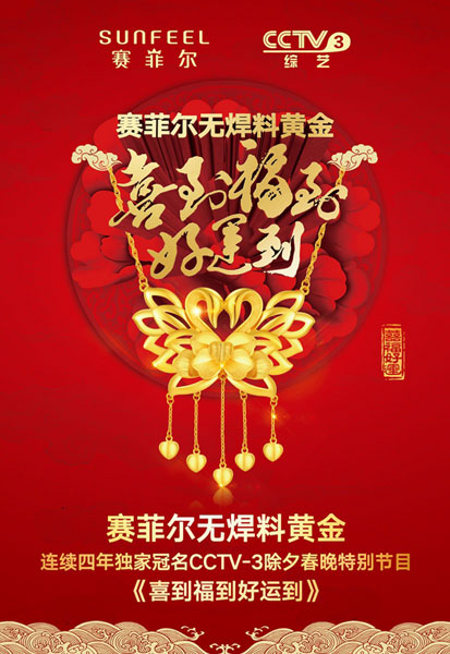 继而,赛菲尔珠宝将目光投注在央视其他综艺节目上,先后赞助《我要上春晚》、《中秋晚会》等大型综艺晚会。2015年,赛菲尔珠宝独家冠名这档拥有高流量、高关注、以及节目互动参与人次高达上百亿的《喜到福到好运到》,不断深挖节目价值,从节目包装、现场布景、版块内容、以及观众与嘉宾奖品等方面,将赛菲尔珠宝打造的无焊料黄金“至纯黄金至纯祝福”融入其中,8小时连续直播不断出现的“赛菲尔无焊料黄金更纯更有价值”以及赛菲尔无焊料黄金产品,让观众对品牌形成了极为深刻的印象,对品牌进行了最好的诠释。