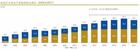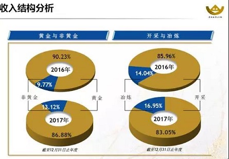 招金矿业自2006年香港上市以来,始终坚持纯黄金的发展定位不动摇。公司自成立以来,黄金产量保持了稳健增长的态势,矿产金产量不断提升,公司2013年至2017年连续5年矿山产金都达到了20吨以上的水平。2017年,公司通过调结构、抓大放小等一系列有效的管理措施,突出黄金主业发展,确保了黄金产量的稳定。公司旗下的夏甸金矿、早子沟金矿黄金产量超过10万两,位列“中国黄金生产十大矿山”;大尹格庄金矿、丰宁金龙、圆通矿业3家矿山自产金产量均过吨金。投行摩根士丹利认为公司与金价关连度高达90%,89%的毛利来自于黄金,是一家纯黄金公司。分析公司的收入结构,不难看出,公司黄金业务和开采业务始终占收入的最主要部分。在公司收入比例中黄金业务比重达到了86.88%,非金业务占总收入比例仅为13.12%;开采收入比例达到了83.05%,冶炼收入占16.95%。