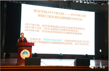 自2017年珠宝学院陆续获得旭平首饰有限公司、ZEGL品牌和东莞尚正堂集团三家企业的奖教学发展基金后,学院积极开展工作,制定落实三家企业的发展基金使用细则,学院将每年用于学生12万元奖学金细化分解到奖励优秀毕业设计、优秀学生干部以及鼓励学生参加行业设计/技能比赛等几个方面,营造学院整体积极向上的学风氛围。