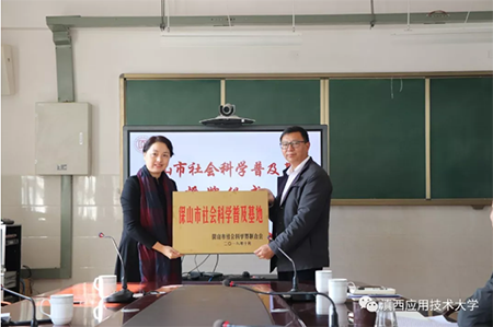11月6日,保山市社科联到珠宝学院举行“保山市社会科学普及基地”授牌仪式。保山市社科联党组书记、主席胡丽华出席授牌仪式。珠宝学院党委书记张雷,党委副书记王正卿,纪委书记杨根凡,党委委员、副院长郭甦,副院长李冬梅及各处室负责人参加授牌仪式。
