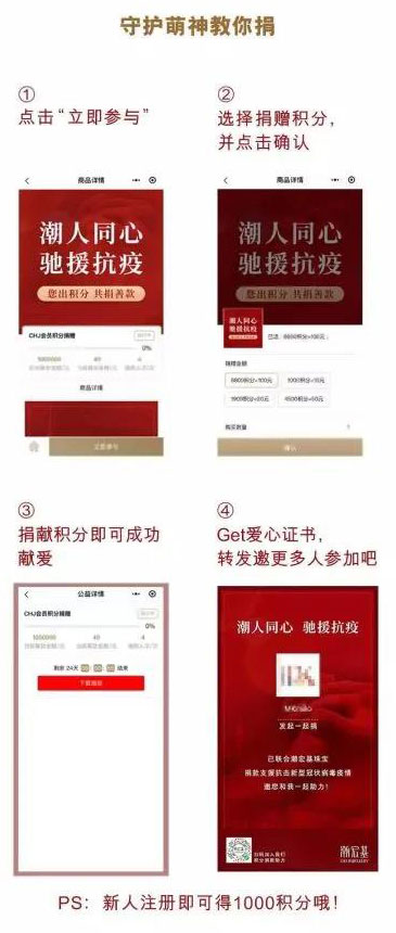 潮宏基发出邀请以会员积分兑换慈善款项驰援抗疫的活动,广大潮宏基会员捐积分即可与潮宏基共捐善款。积分捐赠规则为“可选4个捐献积分等级:8800积分=100元、4500积分=50元、1900积分=20元、1000积分=10元、每位会员可捐赠3次”。潮宏基将以“潮宏基珠宝金彩会员”名义,将款项捐赠给武汉慈善总会以及购置医疗物资定点捐献,用于新冠肺炎的疫情防控,为提升捐款透明度,后续潮宏基将公开捐赠相关明细与证明。