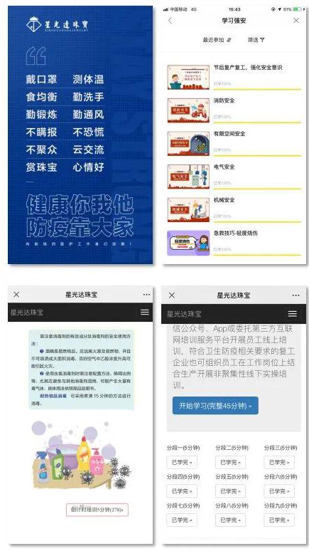 星光达珠宝积极配合政府防疫和复工备档资料提交工作,防控办利用企业微信调研工具对全体员工进行多次系统摸排,充分了解员工动向,掌握员工假期行动路线、自身及家人身体状况,所在地区疫情状况等信息,对员工负责,对企业负责,对社会负责。
