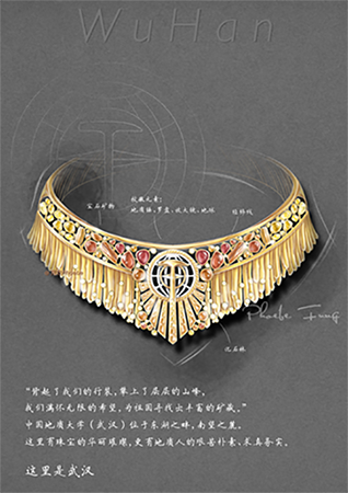 创作日记:初到武汉,地大博物馆是我的第一站,各类地质标本三万余件,罕见珍品三千多件,这时候才对这个会陪伴自己多年的珠宝设计专业有了一些更深的认识,地质、矿物、宝石、首饰,所有的璀璨光华背后都有每一步的积累和坚持——“艰苦朴素、求真务实”。这件首饰以校徽造型为中心,运用了地质锤、罗盘、放大镜、地球的元素,放大的地质锤造型延伸到下方的宝石光芒造型,形成了一个盾牌的造型。项饰上方是各类不同造型、未经标准琢型打磨的宝石,是地大人所探索的“矿藏”,也象征着充满个性的莘莘学子。下方金属造型表现的是地大的化石林,每一份光彩背后都是力量与沉淀。反向来看,这也是一个金色皇冠,母校承载着每个学子的光荣与梦想。