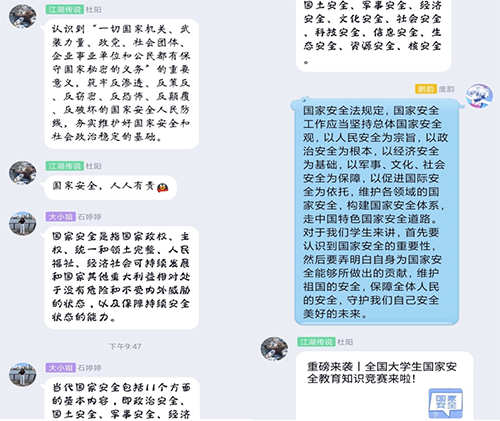 各团支部在交流讨论环节,会场气氛都很热烈,141161班季佳语说:“此次新冠肺炎爆发危及国家安全,警醒我们生物安全领域需要高度重视,公共卫生领域应急反应能力需要提高。我们作为大学生,要积极参与维护公共卫生安全和生物安全,做好日常自我与家庭预防,利用假期丰富自我做好心理调控,提升信息辩识能力,不传谣、不造谣,规范网络言论。”141182巫晨说:“国家安全是安邦定国的重要基石,维护国家安全是全国各族人民根本利益所在,要完善国家安全战略和国家安全政策,坚决维护国家政治安全,统筹推进各项安全工作。健全国家安全体系,加强国家安全法治保障,提高防范和抵御安全风险能力。作为中华人民共和国的公民,我将会自觉承担维护国家安全的责任、遵守法律。” 142191班任嘉星说:“本次课讲述了国家安全问题研究的发展历程,我国总体国家安全体系,新形势下国家安全风险举例说明,疫情对国际的影响等多个方面,并且表达了对大学生的殷切期望。经过本次学习,我明白了安全意识的重要性,我们应该提高国家安全意识,提高社会责任感,应对公共安全事件需要每一个人的努力,我们要清楚地知道‘国家安全,人人有责’,要力所能及地为维护国家安全尽自己的一份力量。”