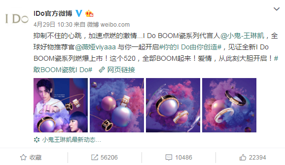 I Do在近期推出的520活动中与新生代偶像@小鬼-王琳凯合作,推出其作为代言人的“I Do BOOM瓷”系列新产品。相关消息在微博发出后,已累计获得超过5.6万次转发及2万多次点赞。市场人士表示,“I Do BOOM瓷”系列产品设计风格前卫大胆,符合年轻消费群体的审美倾向,预计将迎来大量购买。