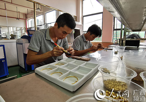 建模、雕刻、抛光……在已经投产的广西东荣黄金珠宝有限公司生产厂房内,工人们在有条不紊的生产黄金首饰。“这里投资政策非常的优惠,地方党委政府的服务也十分贴心。”问起为何选择从深圳来到平桂建厂生产,该公司负责人如是说。