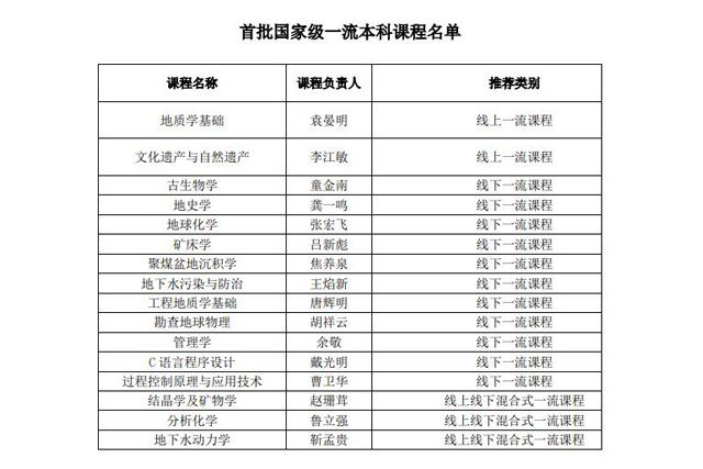 近日,教育部发布了首批国家级一流本科课程认定结果,我校16门课程获批。其中《地质学基础》等2门课程入选国家线上一流课程,《结晶学及矿物学》等3门课程入选国家线上线下混合一流课程,《工程地质学基础》等11门课程入选国家线下一流课程。