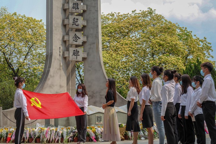 在番禺人民英雄纪念碑前,师生党员们通过清扫英雄纪念碑、朗诵《英雄赞歌》、重温入党誓词、默哀、鞠躬等方式表达对革命先烈的感恩和敬仰,缅怀革命烈士的丰功伟绩。