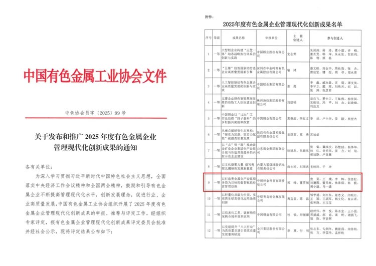 日前,中国有色金属工业协会发布2025年度有色金属企业管理现代化创新成果。